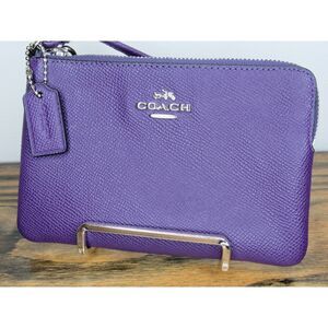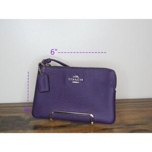 Brighten your day with this gorgeous Coach corner-zip wristlet in a deep, rich shade of purple. Crafted from high-quality pebbled leather, this pouch is designed for convenience and style. Great pre-owned condition!