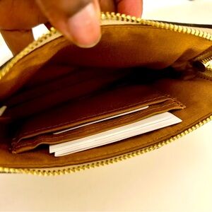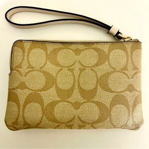 NWT This Coach Corner Zip Wristlet in Signature Canvas in light khaki and chalk has been used once. It’s in pristine condition and ready for a new home. Does not come with a box or dust bag. It’s Signature coated canvas and recycled leather with fabric lining.
