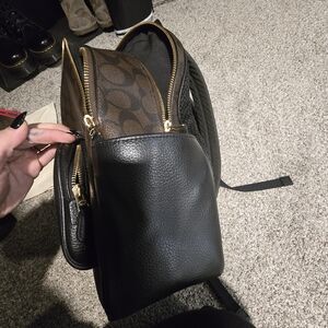 Coach Court backpack with a brown and black color scheme. Ideal for daily use. In excellent condition! Very clean. Zippers work. No signs of wear or damage. 100% genuine leather, Authentic, discontinued and hard to find!