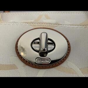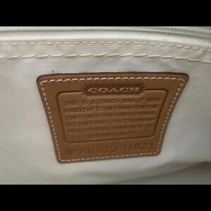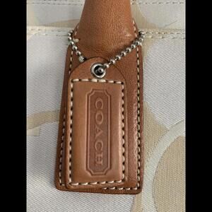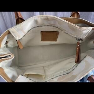 This Coach handbag is the perfect addition to any outfit. With a cream canvas exterior and leather accents, it's both stylish and durable. The square shape, double handles, and 8" handle drop make it easy to carry, while the zip closure and inner pockets keep your belongings secure. The bag also features silver hardware, a C pattern, and logo accents. It's a medium-sized shoulder bag that's great for everyday use.
