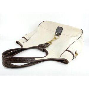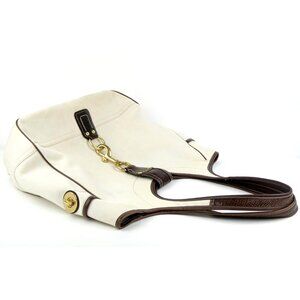 Coach Cream Chalk Canvas Brown Embossed Leather Shoulder Bag Tote 10779 in excellent condition.