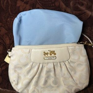 This elegant Coach clutch in a sophisticated cream color features a stylish pleated texture, making it a perfect accessory for formal events. Its compact design and wristlet strap offer both convenience and chic appeal, while the subtle brand embellishments add a touch of luxury.