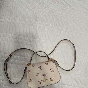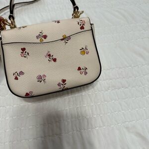Elegant Coach bag with colorful floral accents. Cream leather with vibrant flower details.