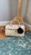 Chic Coach satchel in cream with floral print. Features pink handles and a playful black pom-pom charm.