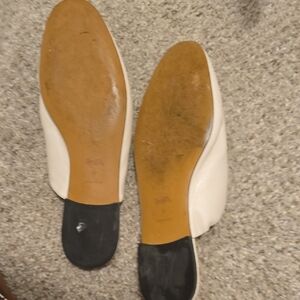 Elevate your footwear collection with these Coach mules, showcasing a refined cream hue and a striking gold chain accent. Crafted with a smooth leather-like material, these shoes offer a minimalist design with a rounded toe and flat sole. Perfect for adding a touch of elegance to any ensemble.