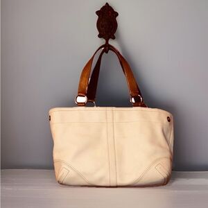 This Coach shoulder bag is a stylish and functional accessory for any woman. The bag has a cream color with brown accents exterior color and a solid pattern. It features a double front pocket, inner pockets, and a bag charm. The bag has a zipper closure and double handles with a 9-inch drop.
