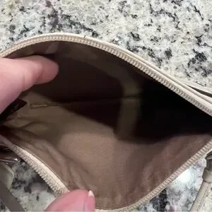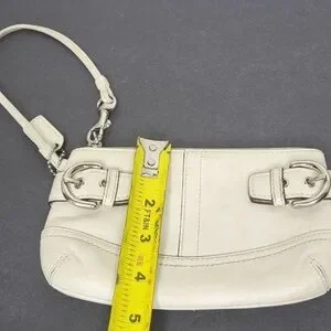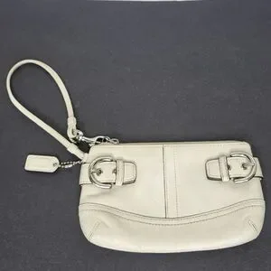 Elegant Coach wristlet in a versatile cream color. Perfect for any occasion, this stylish bag adds a touch of sophistication to your outfit.