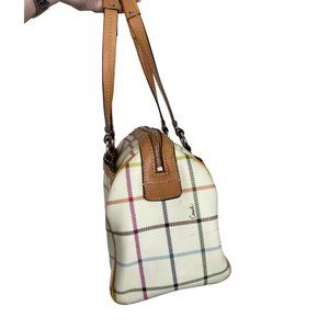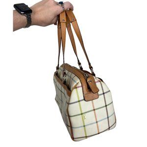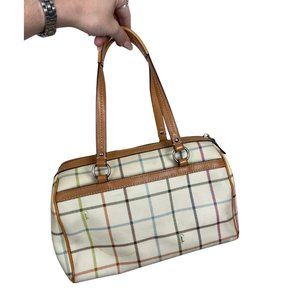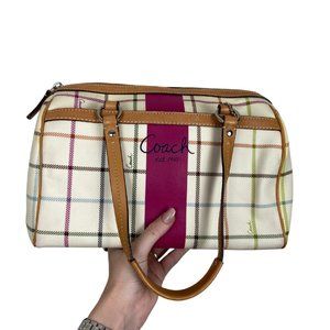 Coach Cream Colorful Plaid Purse in Cream, Pink. Size 12" x 8" x 6.5". In gently used condition w/ some signs of wear but no major issues. Please see photos.