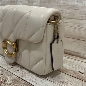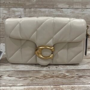 Chic Coach clutch in cream quilted design. Features bold gold hardware. Perfect for any occasion.