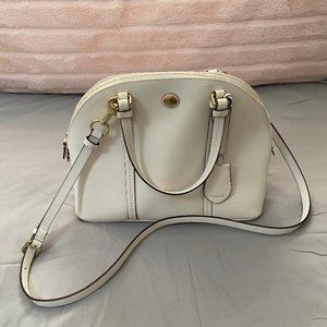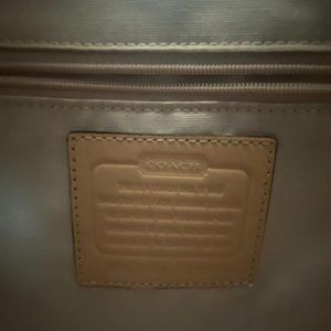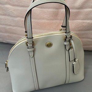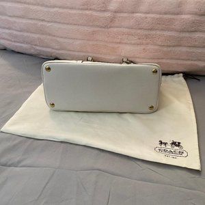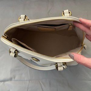 Elegant cream tote with gold accents. Features dual handles and a detachable tag. Perfect for everyday use.