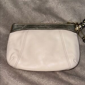 Elegant Coach wristlet bag in a chic cream color, perfect for any occasion. Features a stylish design with a convenient strap for easy carrying.
