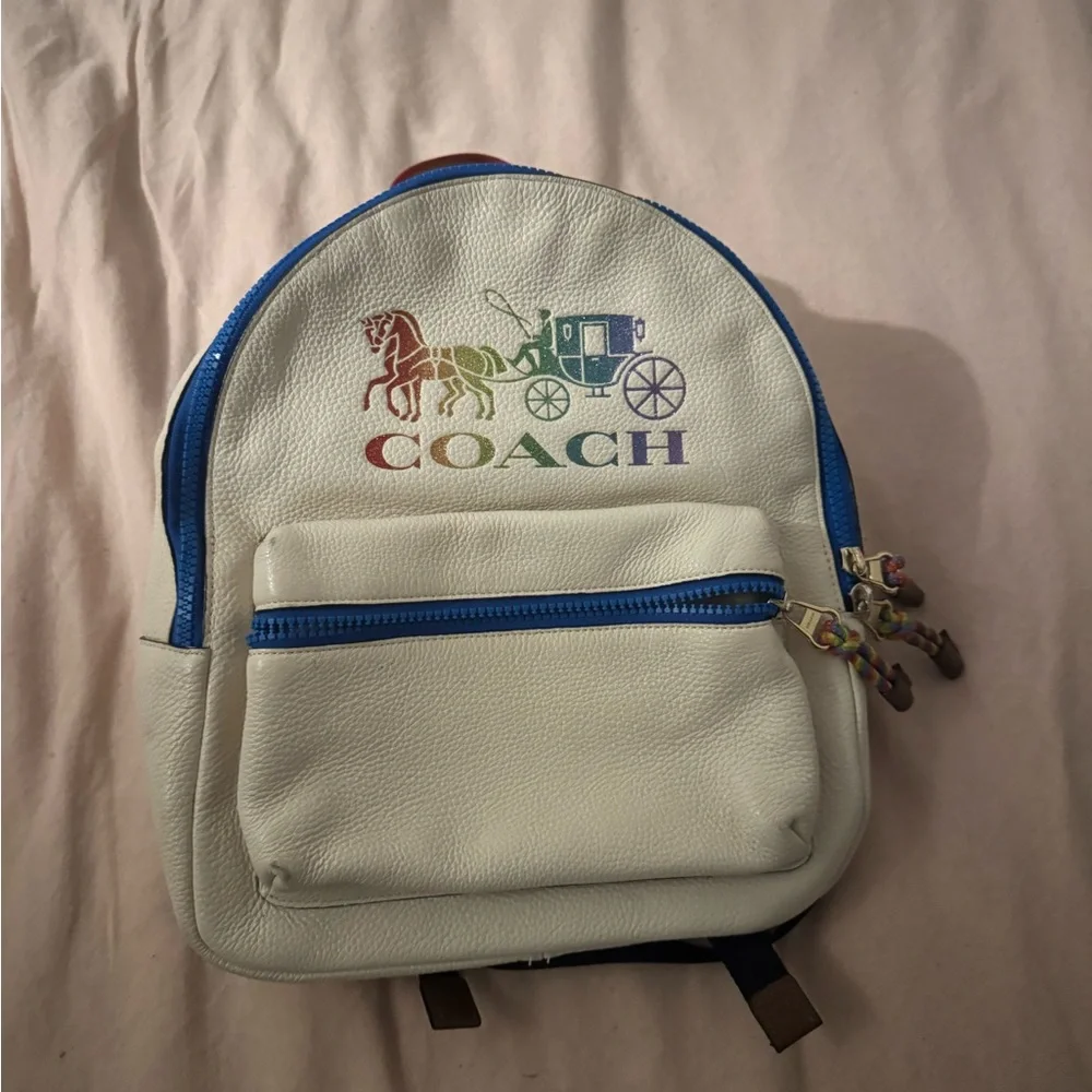 Chic mini backpack with cream body and blue trim. Features Coach logo with colorful design.