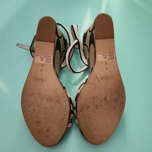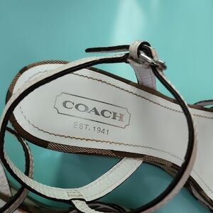 These Coach sandals feature a sophisticated braided design with cream and brown leather straps, offering a stylish and versatile look. The adjustable ankle strap ensures a comfortable fit, while the flat sole provides ease for all-day wear. Perfect for dressy-casual occasions, these sandals effortlessly blend elegance with comfort.