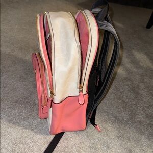 Elegant Coach backpack in cream and coral. Features gold zippers and a front pocket.