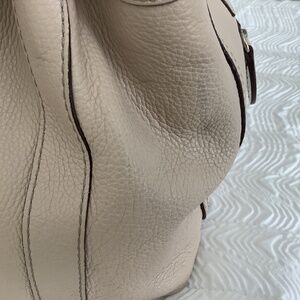 Exterior: Two ivory leather shoulder straps, nickel hardware, Coach hang tag, zippered pocket on front, four nickel feet on bottom Interior: Pink lining, one zippered pocket with authenticity patch, three slip pockets - one for pens/pencils, plain zippered center compartment