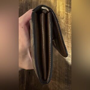 Coach Cream with Brown CC Patterned Clutch with D Rings; exterior is in very good condition with some minor callouts that are all shown in pictures; main callout is some rubbing on the corners of cream corners; excellent and clean interior with many card slots and several different compartments