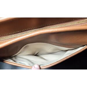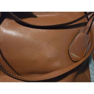 Stylish Coach shoulder bag in camel colored cross grain leather. Perfect for everyday use. Features a sleek design, hang tag, small Coach emblem on the front and slip pocket on the back. Spacious canvas interior has one zippered pocket and two slip pockets. In excellent condition, no scuffs, marks, stains, etc.