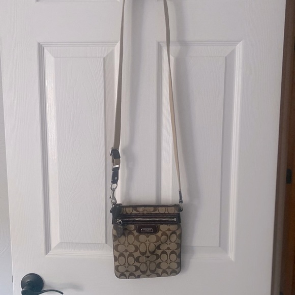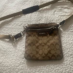 Classic Coach Crossbody. 8 1/2” x 7 1/2”. Canvas beige with beige adjustable strap and leather shoulder pad. Good condition…great for back to school!
