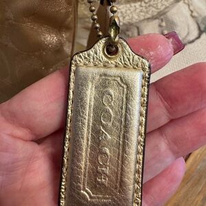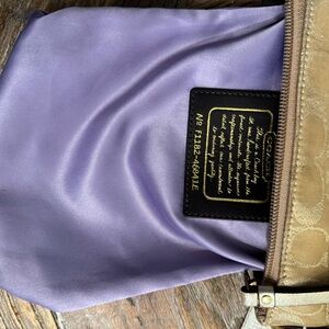 Coach crossbody bag with CC logos. Gold leather and gold canvas with an adjustable strap, gold studs on face, logo leather bag charm, two exterior pockets, zipper closure with iconic leather interior designer plate. Interior color is purple.