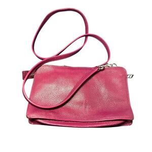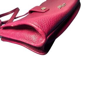 This is an authentic Coach small crossbody purse in a beautiful pink pebbled leather finish. It features a long adjustable strap and snap closure with Coach logo hardware on the front.