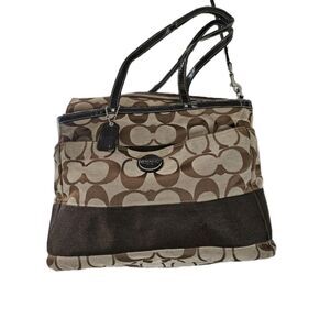 The Coach Crossbody Bag is a stylish and spacious accessory designed for women. Made from brown leather with silver hardware accents, this rectangular bag features a zip closure and a black leather crossbody strap for easy carry. The classic design, solid pattern, and fabric lining make it a versatile option for everyday use. Perfect for adding a touch of luxury to any outfit, this large Coach bag is both practical and fashionable with a signature bag charm and a timeless appeal.