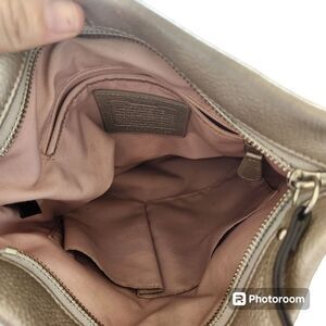 Brand: Coach Size: Small Crossbody Color: Mettalic Silver Style: Metallic silver Crossbody with chain detail and coach insignia Condition: Preloved, good used condition, some wear on back side of bag as pictured