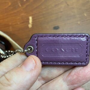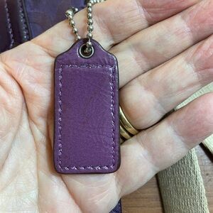 Gorgeous Purple Coach swing pack crossbody bag, serial no 43430. In Coach signature canvas, purple satin interior. One exterior pocket. No pocket on the inside. This bag has a beige guitar strap and original hangtag. No wear on piping. Only calls out are a few very mall white spots on the patent leather piece on the strap where the leather has been scratched. Non-smoking home.
