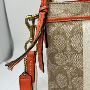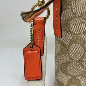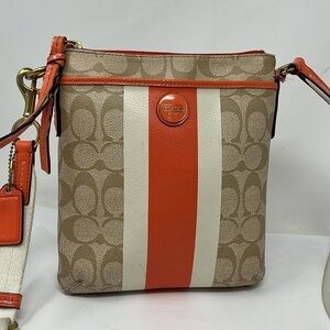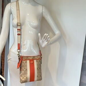 This is a great Coach Crossgrain Crossbody Swing Pack Zip Top Bag. Beige Crossgrain logo beige leather and its coral orange trim. Zipper pull does show wear and can be fixed at a shoe repair. Brass hardware. Two full size slip in from and back compartments. Adjustable crosssbody strap. Clean interior. No odors. No tears. Normal wear scuffs to the corners and cotton strap. 8.5” x 7.5”