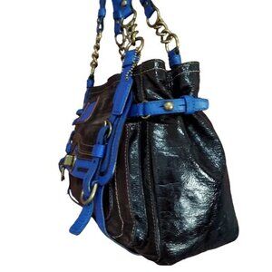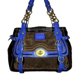This Coach 2008 Limited Edition Legacy Garcia bag is a blend of striking patent and suede leather in dark chestnut, accented with electric cornflower trim. Sized 9 X 12, it's a chic and practical accessory for any occasion. Cursive Creed!!