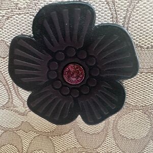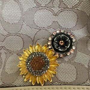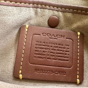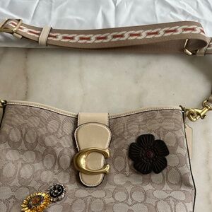 This bag is one of a kind bag. It features three distinct. Coach embellishments that were applied at a Coach store. It also comes with a white Coach dust bag. Height 9 in, Width 11.5 in, Depth 4.5 in. It does have a small scuff mark on the bottom of the bag.