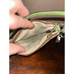 This adorable and rare Coach Daisy Keychain Wallet Mini Wristlet features the signature Coach “C” canvas with a floral appliqué daisy and bright green leather trim—perfect for fans of Old Money, Coquette, or Y2K style.