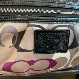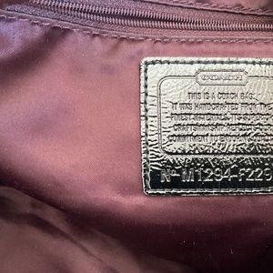 This a vintage back from late 1990s with clean interior in excellent condition. One deep interior side pocket with a zip and two small interior slide pockets. Straps and zippers all in great condition. This handbag has all three pieces of original hardware; the heart zipper pull, the luggage tags and the coach brand tag. It is a slouchy bag, 17 inches high by 14 inches wide. Bag is in excellent condition, well loved and well cared for.