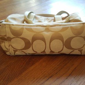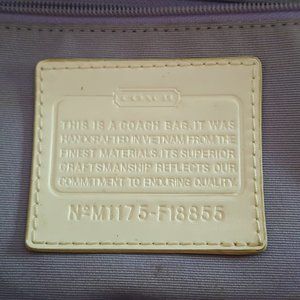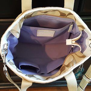 Lilac lining inside, blue Daisy on front, Front small pocket. Inside large side pocket.