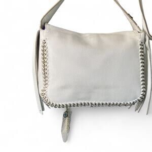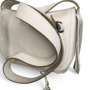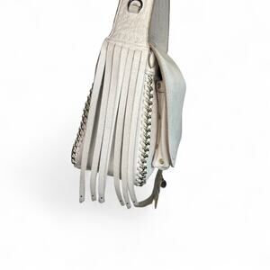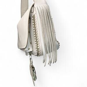 Coach Chalk colored Dakotah Leather Fringe Flap WhipStitch Crossbody bag. Lots of storage in this medium sized bag. Interior side of flap is suede. Interior of bag is a cloth material. Coach Dakota Whiplash Fringe Crossbody Bag with gold tone hardware