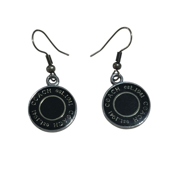 Coach Dangle Black and Silver Enamel Disc Earrings, hooks