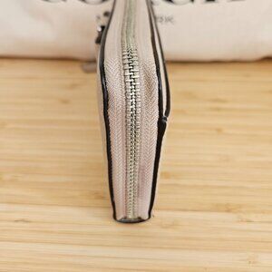 Style Name: Darcy Bow Accordion Zip Wallet Style Number: F51668 Color: Silver/Sand Made Where: Thailand Authenticated in CC: Yes Details/Description: Saffiano leather with bow detail on the front. 12 card slots; 2 side slots; 1 zip compartment and is separated into 3 compartments -Slip pocket on the back • Credit card and multifunction pockets • Full-length bill compartment • Zip coin pocket • Outside open pocket • Zip-around closure Dimensions: 7 3/4" (L) x 4" (H) Condition: Good condition Has some Visible glue transfers on the zipper area and some color spots inside (pictured) I believe it is from the manufacturer and have not attempted to remove them. Stored stuffed to retain shape and always kept in a dust bag. Comes from my smoke-free, pet-friendly home. No old or foul odors were noted. You are purchasing a gently used item, that may have some signs of wear. This can include slight rubbing/peeling on the inside /outside, rubbing/wear on edges/corners, loose stitching, mild coin residue, hardware markings/discoloration, or other overall and general signs related to normal wear/use. Please read the description, view photos, and ask questions before purchasing as all items are sold as is. **Coach dust bag not included - for display purposes only.**
