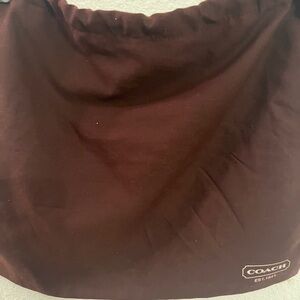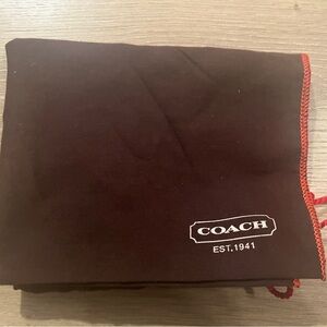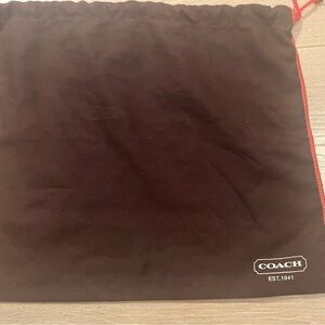 Authentic Coach Dust Bag in a rich chocolate brown color with red stitching and matching red drawstring cords. Features the classic Coach logo with “Est. 1941” printed in white. Measures approximately 17” x 17”, ideal for storing handbags