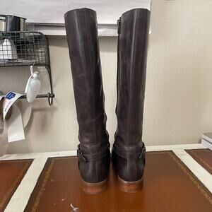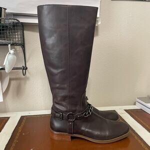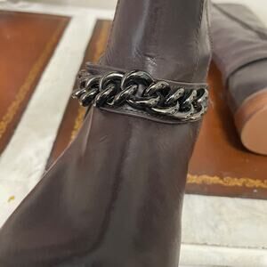 Elegant dark brown leather boots. Features a sleek design with chain detail. Perfect for stylish outings.