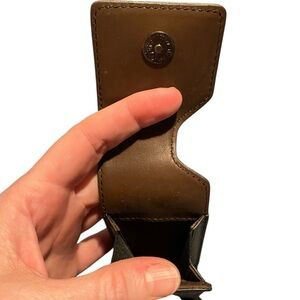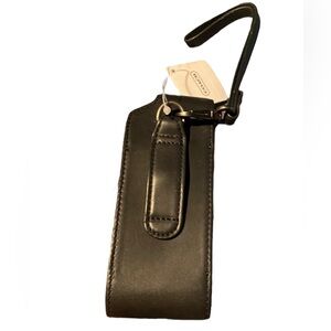 Elegant leather phone holster by Coach. Features a convenient strap for easy carrying.