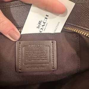 Sophisticated Coach tote in rich dark brown leather. Features sturdy handles and elegant design. Ideal for daily use.