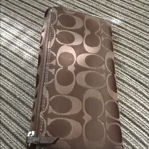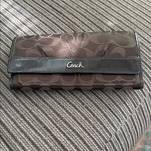 Elegant Coach wallet in dark brown. Features signature pattern and sleek design.