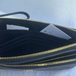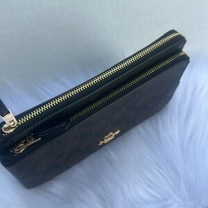 Elegant Coach wristlet in dark brown. Features gold zipper accents. Ideal for daily use. Brand New
