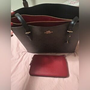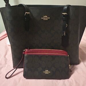 Beautiful, like new Coach tote with matching wristlet. Dark brown with red accents. Perfect for everyday use. See pictures for details and please ask if you need additional info. Thanks for checking out my closet ๐