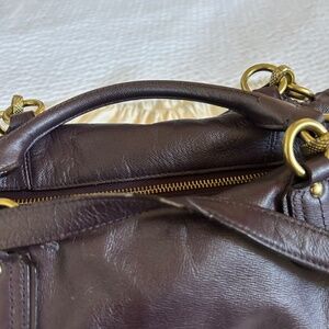 Coach Dark Mauve Colored purse. Clean. Great condition, minor wear on shoulder strap. Two pockets inside as well as a zipper pocket.
