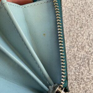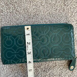 Coach zip around accordion wallet in dark teal or turquoise. 12 card lots, center zipper compartment, 3 open compartments inside. Approximately 8" long and 4" tall.