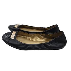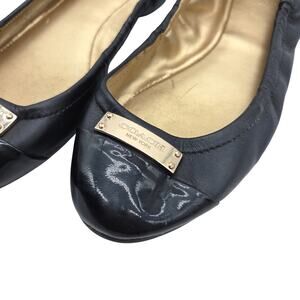 Coach Darsi Black Leather Ballet Flat Size 7 Cap Toe Patent Gold Detail