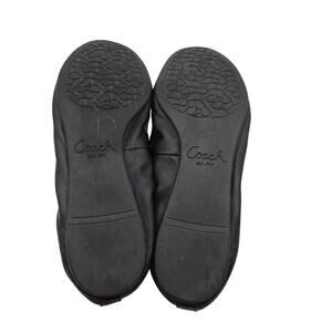 Coach Darsi ballet flats in black leather with patent leather cap toe and gold detail, size 7. Gently preowned, the light white spot on one toe is a dust mark that was removed. Show wear and signs of use, see photos, lots of life left.