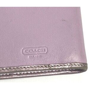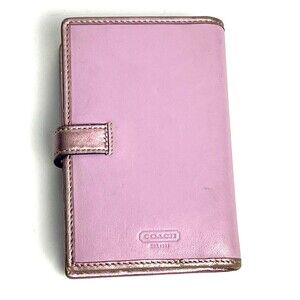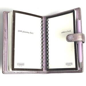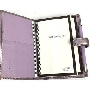 Coach Organizer Planner constructed in Lavender-Purple Leather with Metallic-Lavender Trim. Holds Paper Address Book and Planning Diary Calendar. Metal Lavender Twist Top Pen with Black Ink fits in pen holder. Metal Logo snap ands strap closure.
