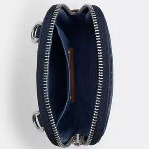 -NWT Coach Aden Signature Denim & Leather Crossbody Bag In Deep Blue, 1.5x5x7.5", Style #CY889, Produced Nov. 2024, Retail $198. Exterior features Deep Blue Signature Denim and navy colored smooth calf leather trim with Vachetta leather accents, silver hardware, zip top closure, detachable and adjustable black webbed strap (1.25") with 18 - 29" drop for shoulder/crossbody wear, and Vachetta leather hang tag. Interior features blue fabric lining with inside deep multifunction pocket.