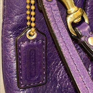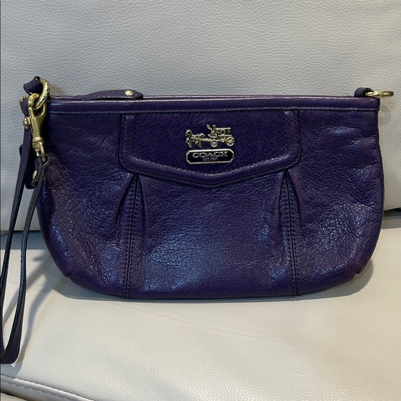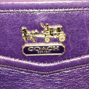 Chic Coach wristlet in deep purple leather. Features a sleek design with gold-tone accents. Ideal for versatile styling.